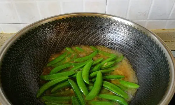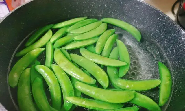 将切好的甜豆放入沸水中焯水煮至断生后捞出沥干备用,这样可去除豆荚中的生涩味,让甜豆更加鲜嫩可口。