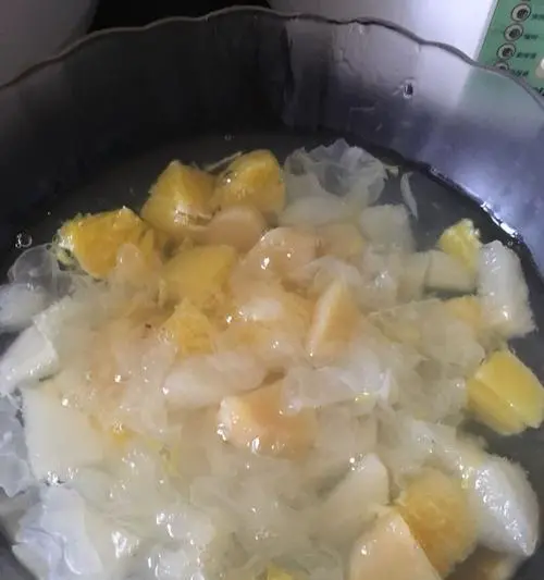 在煮了一会儿后,加入冰糖,然后继续煮至冰糖融化。为了让银耳羹的味道更好,你可以加入一些姜片。