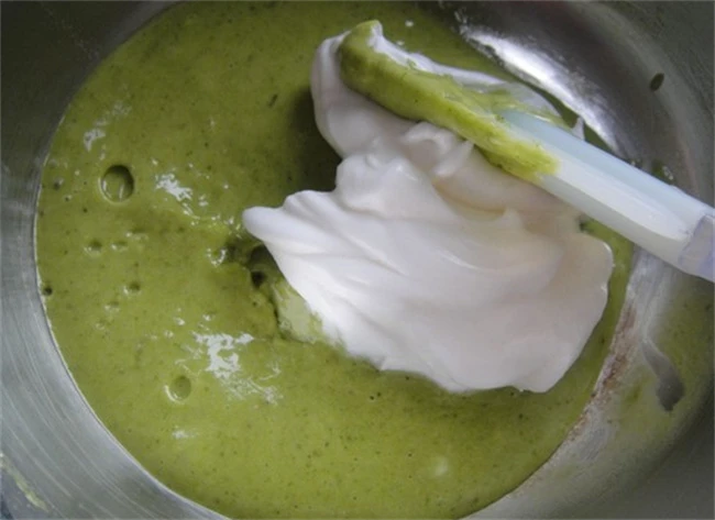 放完玉米油的蛋黄呈现粘稠的状态,这一步是为了让蛋黄和油充分融合乳化。打好之后再把牛奶倒进去,搅拌均匀。然后用细筛,把低筋面粉,泡打粉以及抹茶粉都塞到蛋黄里面。然后用铲子采用上下翻拌的方式把面粉和蛋黄充分融合,均匀一定要搅拌,到里面没有颗粒的状态,但是不能顺着一个方向搅拌,如果面粉糊上劲儿,做出来的蛋糕容易分层。