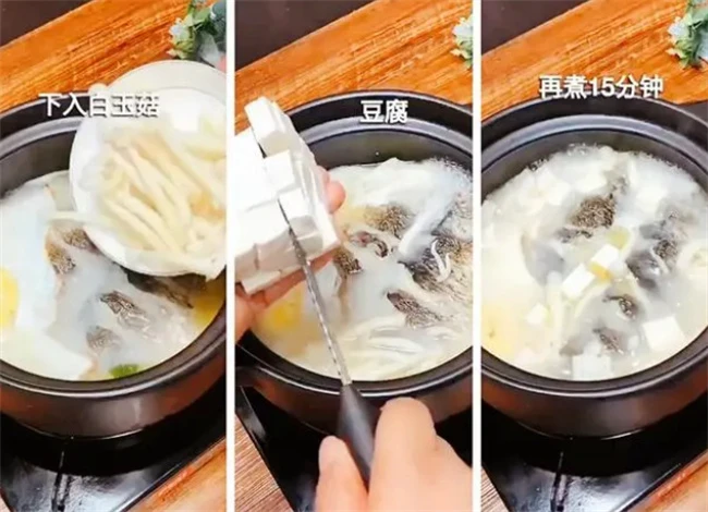 大火煮开煮的过程先不要盖盖子,让鱼的腥味再次向外挥发出去。大概煮5分钟左右汤就能变成白色加入几滴料酒,继续炖10分钟左右,再把豆腐放进去小火慢炖。一般炖鲫鱼汤,加入开水之后总共炖25分钟到30分钟左右就可以了。这个时候的汤刚好发挥出他最好的营养价值,口感和味道都是最好的时候,如果炖的时间太长,反而失去了鱼汤的鲜美味道。