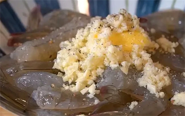 先把大虾去壳去除虾线,留虾尾用少许盐和生粉抓均匀再用清水冲洗干净。虾尾稍微有些硬,在抓的时候一定要注意不要扎伤手,第1步用生粉和盐抓是为了能够让大家清洗得更干净。抓匀之后把大虾用清水冲洗干净冲干水分之后,再放入适量盐,胡椒粉和适量生粉,抓匀腌制。把大蒜切成蒜末,注意这一步一定不能拍大蒜,要直接整粒的,蒜切成小粒。这样蒜的口感更好。