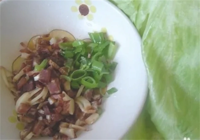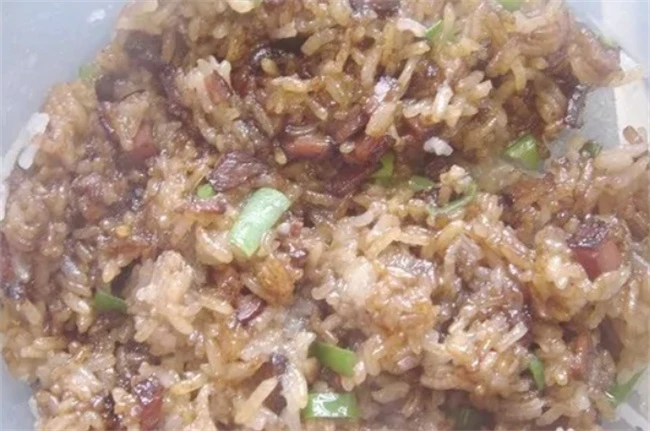 蒸糯米饭的这个时间把腊肉放在锅里面,用开水煮30分钟,要来回翻滚去除腊肉的烟熏味,同时也能帮助把腊肉清洗干净。煮好的腊肉取出来,稍微用水冲凉,切成一厘米左右的小丁。准备适量葱花,锅里面油热之后,葱花炒香,然后把腊肉丁放进去,炒道腊肉变成透明之后,把蒸好的糯米饭加进去翻炒均匀。也可以加点胡萝卜丁或者土豆丁提升口感。