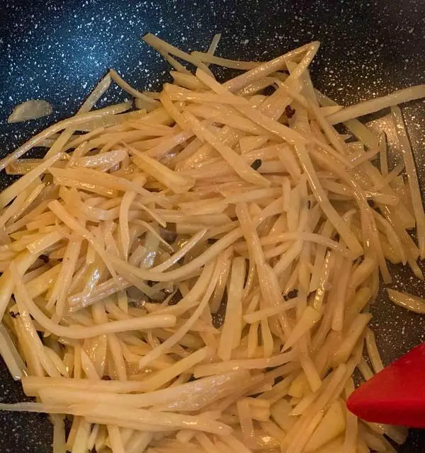 将泡洗好的土豆丝放入锅中,不停地翻炒,炒至土豆丝断生,表面微微发黄。