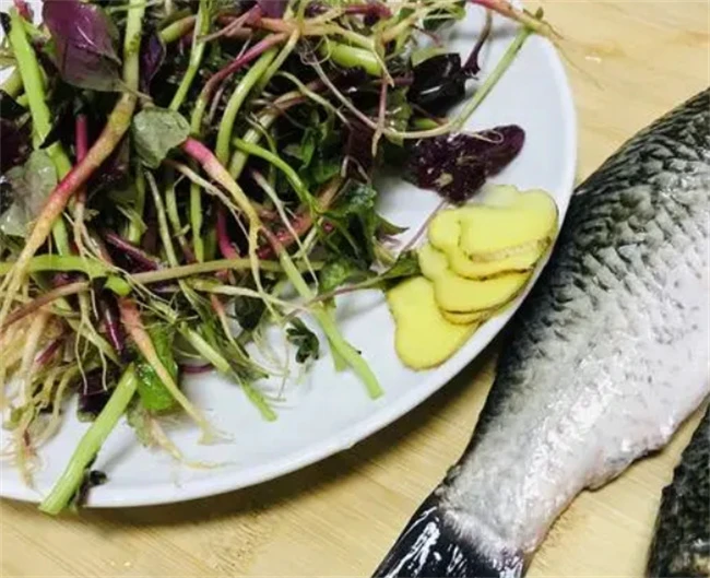 清热解毒的苋菜鲫鱼汤其实做法特别简单。做鲫鱼汤需要先把食材准备好,去市场上买回两条新鲜的鲫鱼,适量苋菜根,一般苋菜根在市场上很少有卖,可以去乡下的地里面采点回来。在准备适量葱姜。买回来的鲫鱼先用清水冲洗干净,去掉鱼腹里面的黑膜,这种黑膜特别腥,黑膜血水以及鱼鳃都清洗干净。洗干净之后把水空一下。然后把葱切成段姜切成片。这个汤基本上不用其他调料,只要放葱,姜盐胡椒粉就可以。
