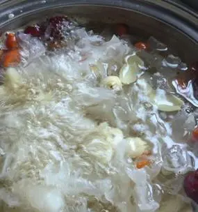 将浸泡好的银耳放入锅中,加水慢火煮30分钟,直到完全透明。