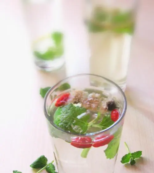 将准备好的薄荷叶加入茶饮中,能够让整个茶饮更加清凉爽口,提神解暑的效果更佳。