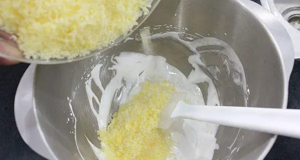 将椰蓉倒入打好的蛋白中,轻轻搅拌均匀。