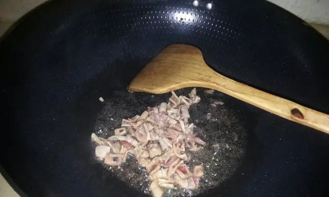 浸泡好的干鱿鱼要彻底清洗干净,特别是在干鱿鱼的口袋和突起处容易藏污纳垢,要认真清洗干净。