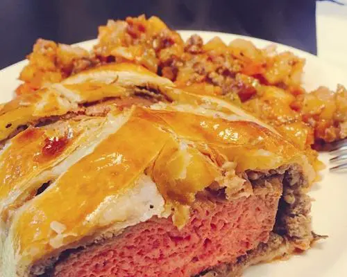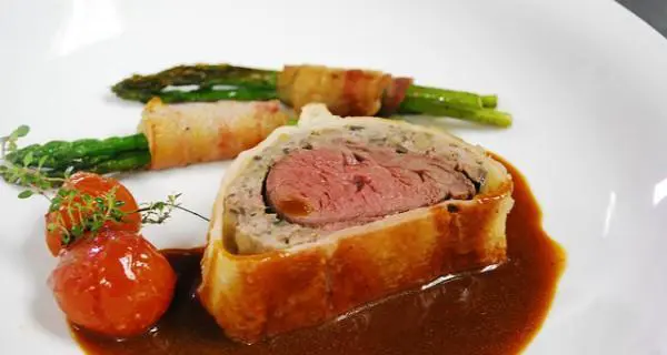 经过一系列的步骤和烹制,一道香气扑鼻、口感绝佳的威灵顿牛肉就做好了。现在,您可以享受这道美食啦!