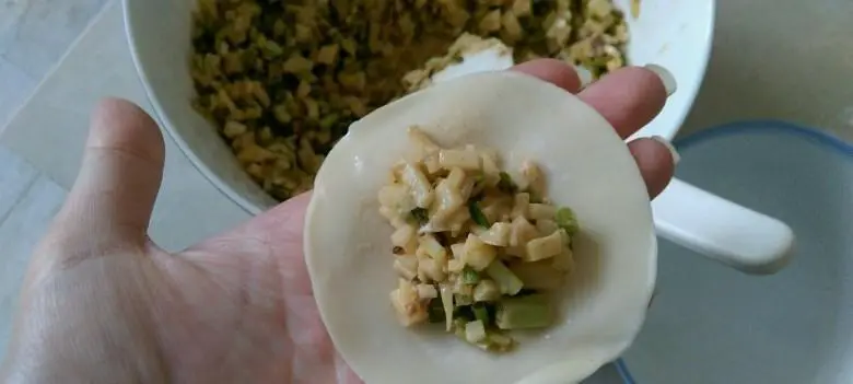 1.将调制好的馅料放入擀好的饺子皮中间;