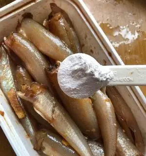 将腌制好的小鱼条裹上适量的淀粉,将淀粉均匀地沾在小鱼条上,这样小鱼条炸出来会更加香酥可口。