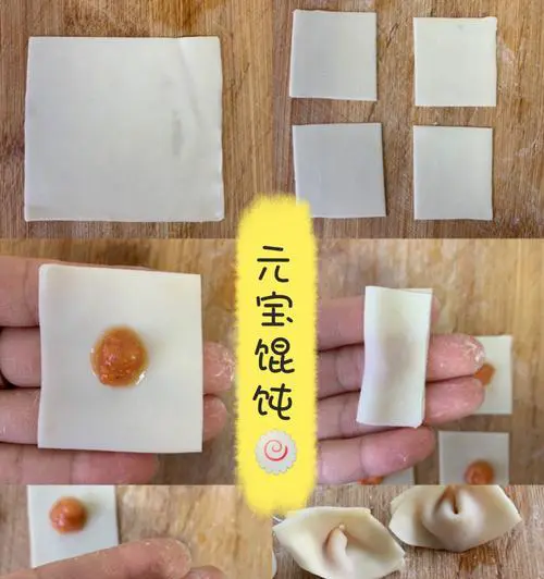 将馅料放在擀好的面皮中央,然后将面皮对折,用力捏合边缘,成折角状。再将两个折角合并捏合成馄饨形状。