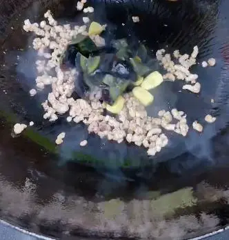 3. 起锅倒入少量食用油,将猪肉末、蒜片、皮蛋放入锅中进行翻炒。