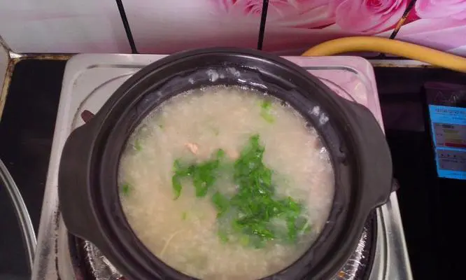 2.继续慢火煮制,直到米粥软烂、芥菜熟透。