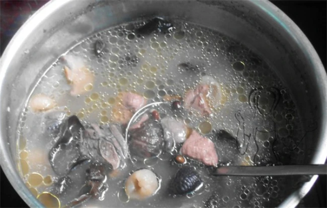所有的食材除了枸杞之外,其他的全部都放进砂锅里面,提前泡好的黑豆再次清洗一遍,一同放进去加入大概食材4~5倍的清水。先用大火烧开观察一下,如果水里面还是有浮沫,一定要用路勺捞干净,这些浮沫虽然不会影响口感,但会影响汤的颜值。大火煮10分钟左右转成中小火,煲一个半小时。汤炖好之后,加入适量盐调味,再把枸杞放进去煮三分钟即可。