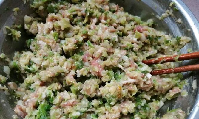 将切好的酸菜与猪肉混合在一起,再加入切碎的葱、姜、蒜和适量的盐、香油等调味品,搅拌均匀。