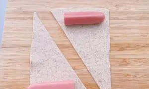 将切割好的酥皮包裹在香肠上,用刀切割出适当长度,然后用手指将两端进行捏紧,确保香肠不会从酥皮内滑出。