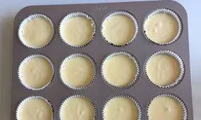 将纸杯放在烤盘上,然后将打好的面糊倒入纸杯中,约8分满即可。接着,用筷子将面糊搅拌均匀,使其不会出现空隙。
