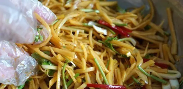 经过上述的制作和处理后,腌芥菜丝已入味,风味独特,酸辣可口,口感脆嫩。