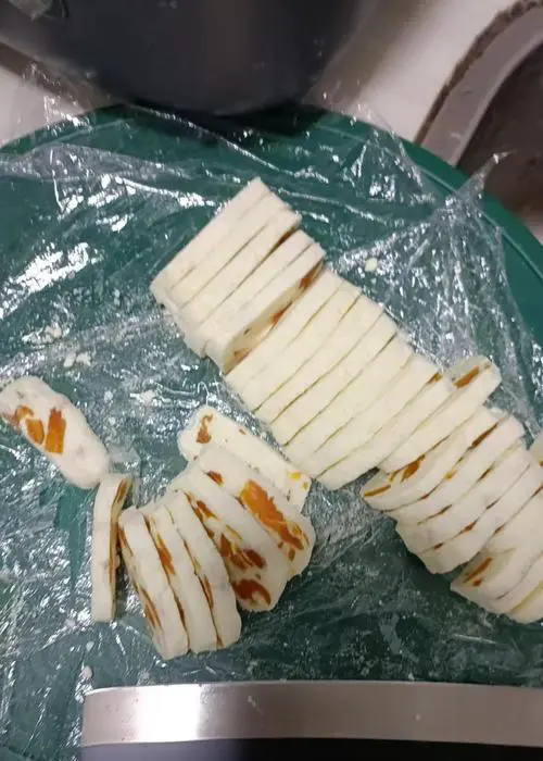 将制作好的牛轧糖放入密封袋中,然后用擀面杖轻轻敲打,将其压成均匀厚度后取出。再用刀具将其切成适当大小的小块。