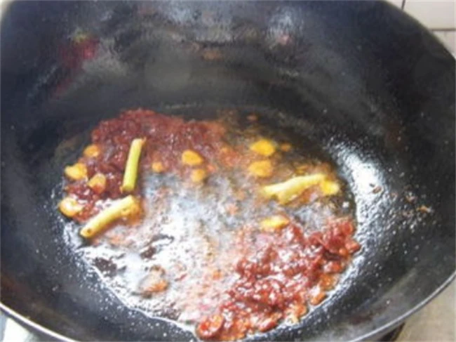 通常我做水煮肉片都是喜欢放圆白菜或者大白菜,把菜洗干净之后控一下水锅里面烧油,油热之后把蔬菜放进去大火翻炒,不用炒到断生,只要翻炒几下让他稍微变软一些,不支楞起来就可以了。因为一会儿要加入水煮肉片的汤再烫一下,那样菜吃起来的口感是刚刚好的。炒好的青菜装在大碗底下备用。锅里面再加入一点食用油,然后下入一条皮线豆瓣酱炒出红油。
