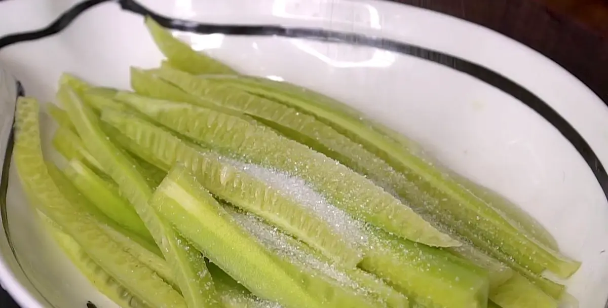 将黄瓜洗净后去皮,切成细条,然后在黄瓜条上撒上盐,拌匀后腌制15分钟,这样可以去除多余的水分。