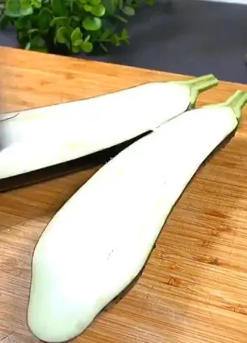 1. 准备一个嫩茄子,不要去掉蒂,直接用刀切成两半。