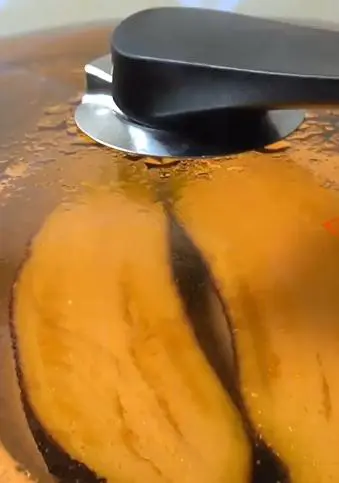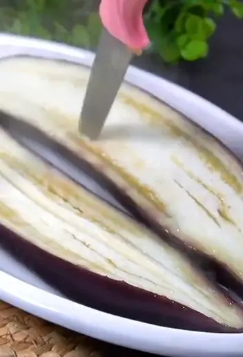 4. 茄子蒸好后用刀子划开,这样能够方便入味。