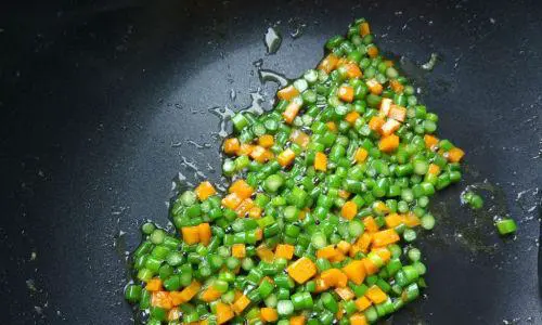 六、加入蒜苔:在蛋液炒至半熟时加入蒜苔丁,快速翻炒。