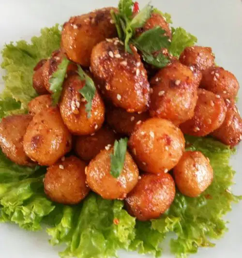 将炒好的蒜香小土豆倒入盘中,淋上适量的香油,使其更具香气。