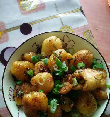 将制作好的蒜香小土豆装入盘中,撒上适量的葱花和香菜,美味可口的蒜香小土豆佳肴就制作完成了。