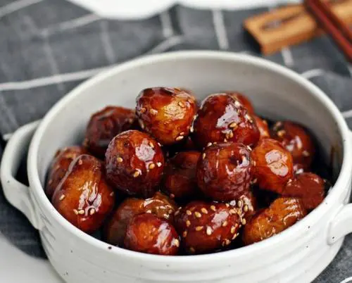 将烤好的小土豆倒入炒锅中,加入调料汁和蒜泥酱,用中火翻炒均匀,直到土豆均匀的裹上酱汁。