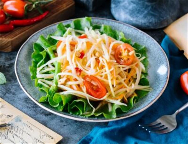 青木瓜沙拉是泰国北部的一道美食,所使用的木瓜并不是成熟的,红色木瓜而是用的青木瓜,口感就像黄瓜一样,甜味不大,还略带一点酸涩的味道。在泰国东北部特别喜欢这种吃法,把它放在腌鱼酱里面,口感特别清爽,香脆的木瓜蘸着酸甜的酱汁,还带着坚果的味道,微微有一些辣味别,具一番风味。