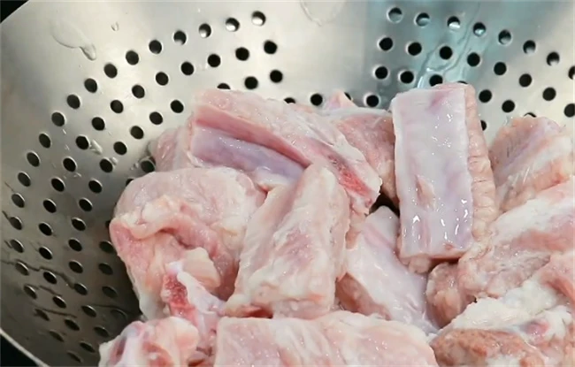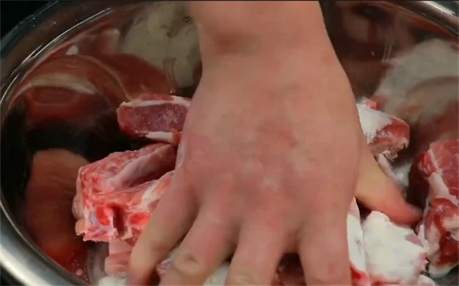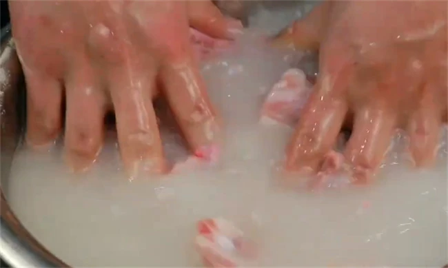 2.将肋条放入盆中加入面粉和水用手抓匀。