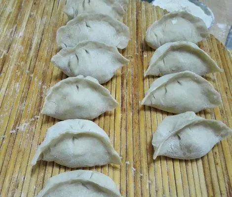 将面球分成小剂子,并用擀面杖擀成薄皮,成为饺子皮。饺子皮越薄,口感越好。