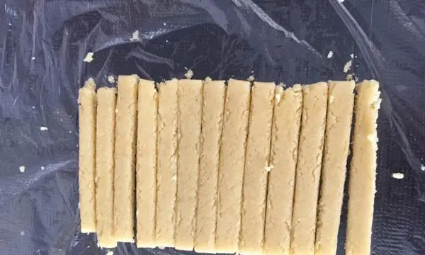 将冷却好的特浓牛乳棒从模具中取出,切成条状。