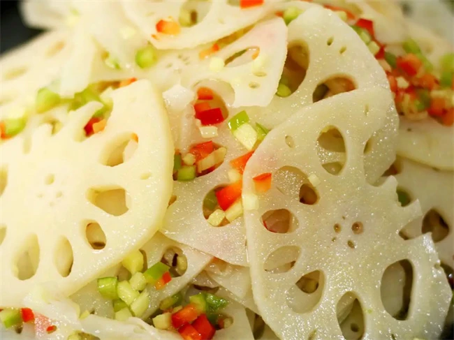 姜汁莲藕:去石榴莲藕去皮,切成薄片儿,放在清水里面浸泡,准备适量姜沫儿。还有青红椒都切成小丁锅里面烧水,加入三克白醋,水开之后把藕片放进去焯水,焯熟之后捞出来用凉水冲洗。把莲藕冲凉之后放在盘盆子里面,加入青红椒丁和蒜末。还有适量食盐,白醋鸡粉,香油搅拌,均匀装盘儿即可食用。这道菜虽然放了姜末,但吃起来姜的味道不是特别浓,口感特别适合秋天吃。
