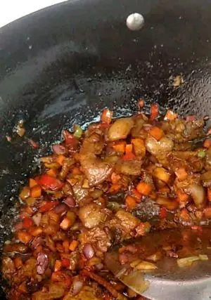 加入适量盐、胡椒粉、料酒、鸡精、生抽、老抽,煸炒均匀。