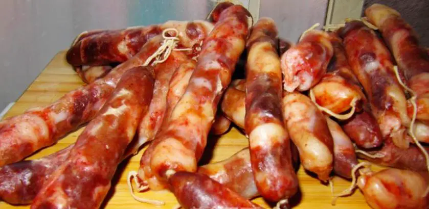 然后就是制作过程了首先将切好的猪肉放在容器里,然后放入盐、白糖、五香粉、胡椒粉、高度白酒、老抽、姜汁,并且彻底搅拌均匀,腌制1小时。然后将买回的肠衣充分的浸泡,挂在机器灌肠杆上,并肠衣前端打结,将腌好的肉倒入机器料斗,开始灌肠。在全部灌完整条肠衣,尾部打结,用棉线将其分段扎。最后将其放置在阴凉通风的地方,视个人喜欢,晾10天左右,取下冷冻保存即可。(高度白酒是用来防腐的,不得不放。并且肠衣浸泡水温不得太高,以免影响肠衣强度。)
