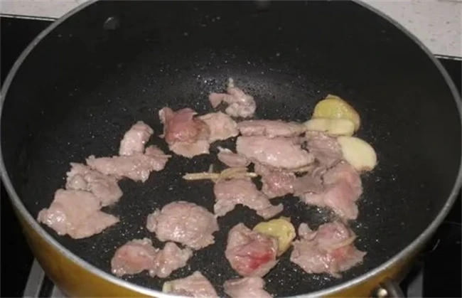 第三步爆炒瘦肉。起锅烧油,油热后下入准备好的葱,姜,干辣椒,不断的进行翻炒,直到炒出香味,然后我们向其中加入腌制好的瘦肉,用锅铲将其搅散,翻炒至变色即可。
