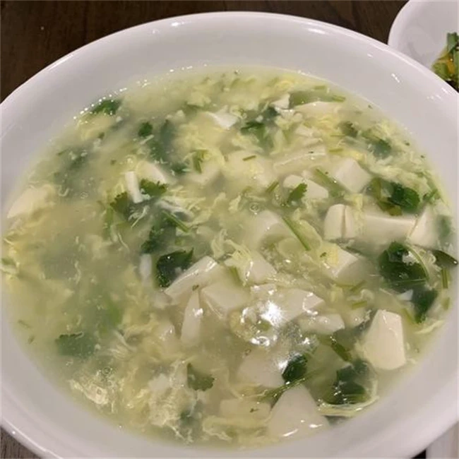 此刻我们将事先切成条的豆腐放到锅里,利用汤水将其煮开之后,正好盐也开始入味,等发现锅里面的汤水已经变得特别浓稠了,豆腐也跟汤水融合在一起,此时我们在锅里面放入事先准备好的香菜或者是我们将所有的盛出,在碗里面放入一点点香菜。就这样一碗美味可口的香菜豆腐羹,已经制作完成。而这碗香菜豆腐羹中有鸡汤,所以它会更加的美味。