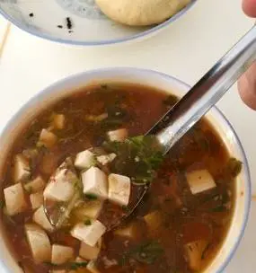 待香菇豆腐羹炖好后,把汤倒入碗中,撒上适量葱花,即可上桌食用。