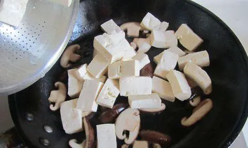 在锅中倒入清水,加入豆腐和炒好的香菇,然后加入调料。将豆腐和香菇烧煮约10分钟。