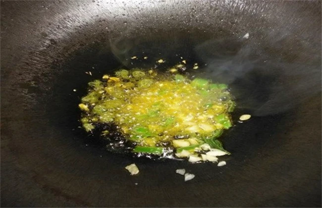 第三步起锅烧油。起锅烧热,锅热后加入适量的油,油热后放入准备好的生姜,葱段以及干辣椒,不断进行翻炒,直到炒出香味。