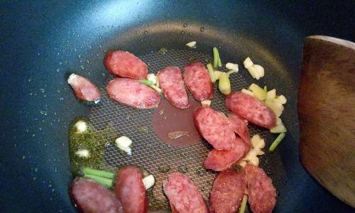 锅中倒入适量油,待油热后放入香肠小段,翻炒至香肠表面微微焦黄。