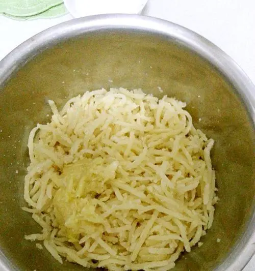 处理土豆是这道菜品制作的关键步骤之一。我们需要把土豆的外皮削掉,然后把土豆切成丝状。接着,我们需要将鸡蛋打散,并将土豆丝放入鸡蛋液中拌匀。将淀粉倒入拌好的土豆丝中,搅拌均匀,使淀粉均匀地附着在土豆丝上。