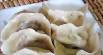 将制好的馅料放在水饺皮上,然后将皮对折,捏紧边缘,收口成半月形的水饺。