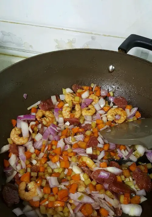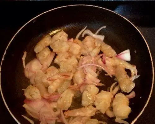将清理好的虾放入锅中翻炒,直至变色。