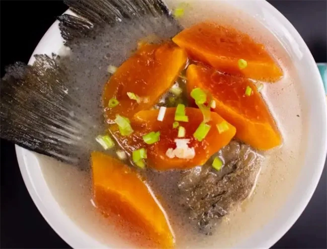 木瓜鱼尾汤,木瓜当中的蛋白酶有促进食物消化的效果,能够帮助消化不良的人,胃肠道蠕动促进消化吸收,做法也特别简单,把鱼尾处理干净之后用油煎至两面金黄加入姜片和葱段,炸出香味儿之后再加入适量开水,鱼尾炖成白色的汤汁,然后把切好的木瓜放进去,炖至木瓜软烂煮锅的时候加盐和白胡椒粉调味儿。