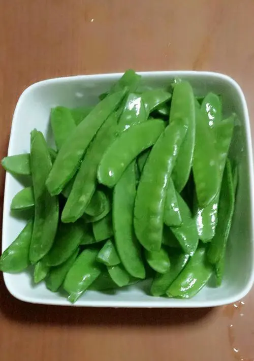 将荷兰豆去头去尾,用开水焯烫一下,再过冷水。